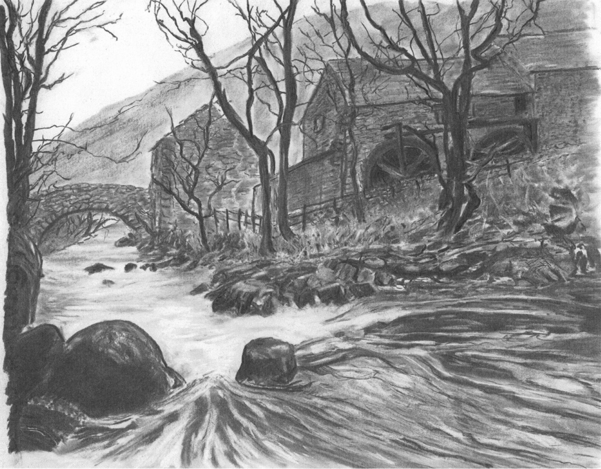 A Charcoal drawing of Eskdale's ancient watermill and packhorse bridge where corn was ground, and later, bobbins turned from locally coppiced Oak.