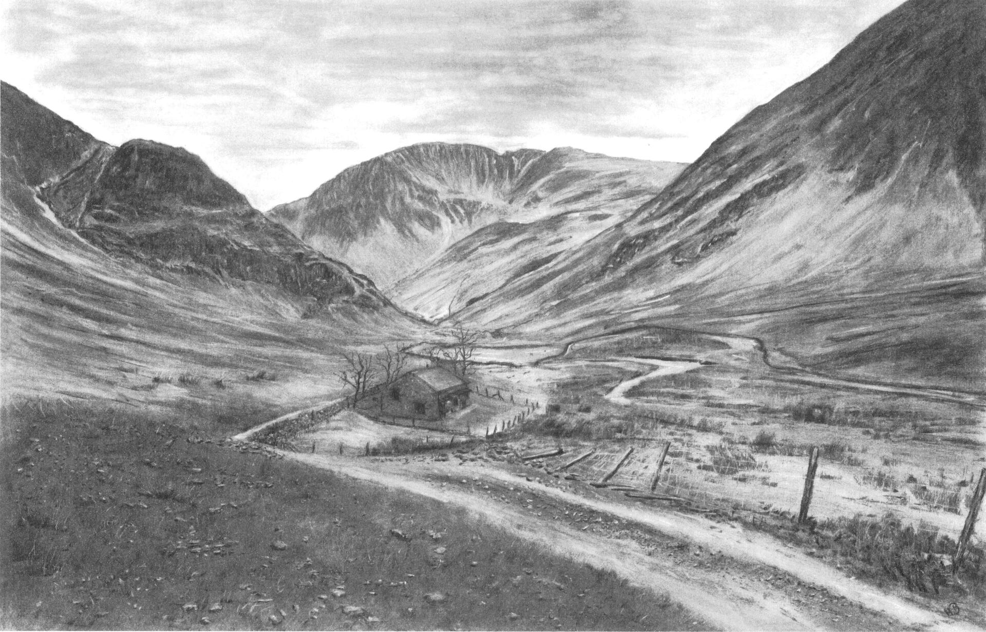 A Charcoal drawing of the wild and remote Seathwaite valley from the ancient Graphite mine.