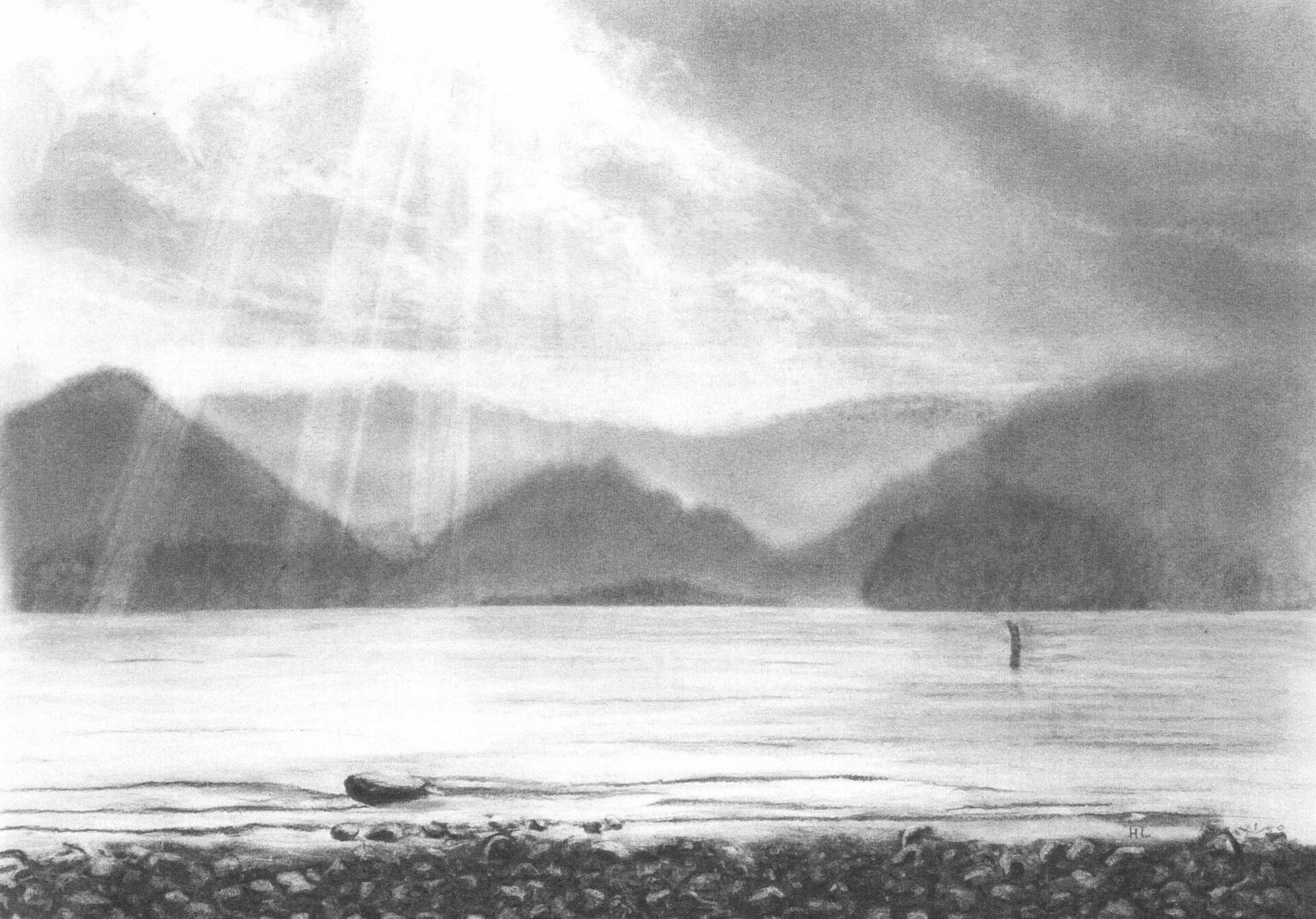 A Graphite and Charcoal drawing of the graceful slopes of Whiteless pike nestled against the fells of Buttermere. This view is seen from above the spectacular Newlands pass where the high fells are seen in a vista surrounding the beautiful lakes of Crummock water and Butteremre.