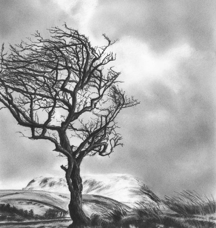 A Graphite and Charcoal drawing of May crag jutting from the high butress of Hindscarth above the tranquil